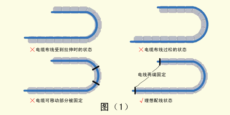 2、如果電纜在布線時愛到張力拉伸,會與拖鏈內(nèi)壁產(chǎn)生摩擦導(dǎo)致護(hù)套磨損。反之如果布線過于松散,同樣會與拖鏈的內(nèi)壁產(chǎn)生摩擦造成護(hù)套磨損,并且容易與其他電纜產(chǎn)生纏繞現(xiàn)象。電纜的布線長度應(yīng)設(shè)定在剛好能通過拖鏈的中心線宜。電纜的移動部分如果被固定,會導(dǎo)致彎曲應(yīng)力無法被分散和吸收,會在固定位置造成應(yīng)力集中。電纜的固定部分應(yīng)設(shè)置在拖鏈的兩端。如圖(1)