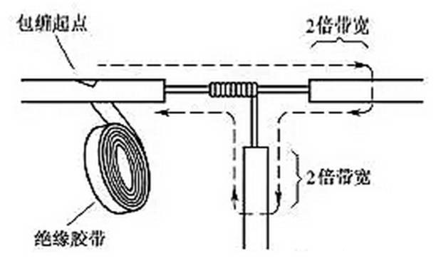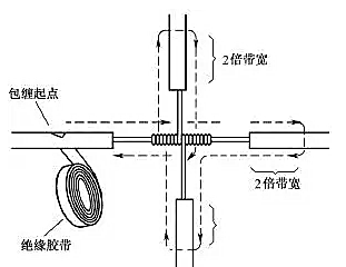 導(dǎo)線分支接頭的絕緣處理基本方法同上,T字分支接頭的包纏方向如圖21所示,走一個T字形的來回,使每根導(dǎo)線上都包纏兩層絕緣膠帶,每根導(dǎo)線都應(yīng)包纏到完好絕緣層的兩倍膠帶寬度處。