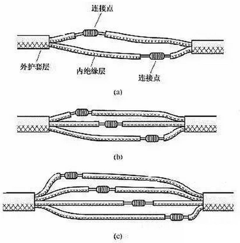 (7)雙芯或多芯電線電纜的連接。雙芯護套線、三芯護套線或電纜、多芯電纜在連接時,應(yīng)注意盡可能將各芯線的連接點互相錯開位置,可以更好地防止線間漏電或短路。圖11(a)所示為雙芯護套線的連接情況,圖 11(b)所示為三芯護套線的連接情況,圖11(c)所示為四芯電力電纜的連接情況。