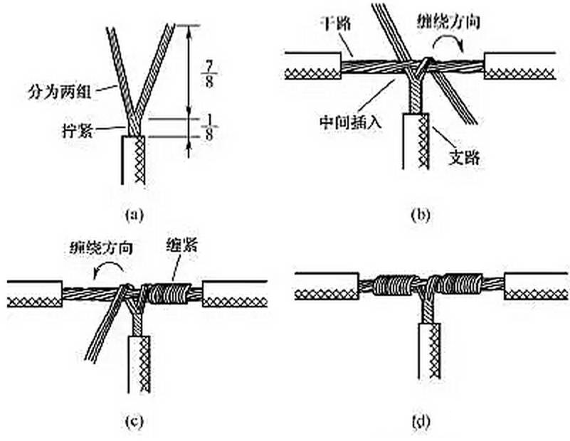 另一種方法如圖8所示,將支路芯線靠近絕緣層的約1/8芯線絞合擰緊,其余7/8芯線分為兩組[見圖8(a)],一組插入干路芯線當中,另一組放在干路芯線前面,并朝右邊按圖8(b)所示方向纏繞 4~5圈。再將插入干路芯線當中的那一組朝左邊按圖8(c)所示方向纏繞4~5圈,連接好的導(dǎo)線如圖8(d)所示。