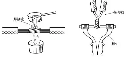 較粗(一般指截面16mm2以上)的銅導(dǎo)線接頭可用澆焊法連接。澆焊前同樣應(yīng)先清除銅芯線接頭部位的氧化層和黏污物,涂上無酸助焊劑,并將線頭絞合。將焊錫放在化錫鍋內(nèi)加熱熔化,當熔化的焊錫表面呈磷黃色說明錫液已達符合要求的高溫,即可進行澆焊。澆焊時將導(dǎo)線接頭置于化錫鍋上方,用耐高溫勺子盛上錫液從導(dǎo)線接頭上面澆下,如圖14所示。剛開始澆焊時因?qū)Ь€接頭溫度較低,錫液在接頭部位不會很好滲入,應(yīng)反復(fù)澆焊,直至完全焊牢為止。澆焊的接頭表面也應(yīng)光潔平滑。