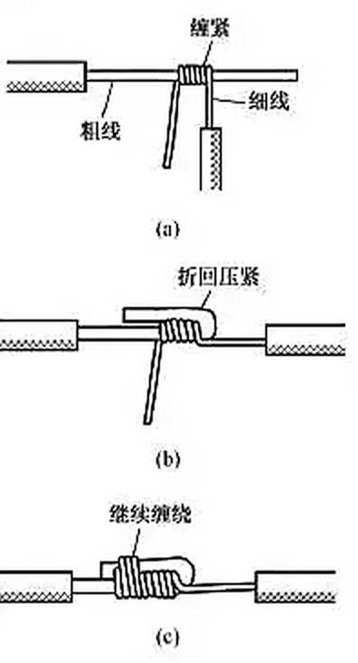 不同截面單股銅導(dǎo)線連接方法如圖3所示,先將細導(dǎo)線的芯線在粗導(dǎo)線的芯線上緊密纏繞 5~6圈,然后將粗導(dǎo)線芯線的線頭折回緊壓在纏繞層上,再用細導(dǎo)線芯線在其上繼續(xù)纏繞3~4圈后剪去多余線頭即可。