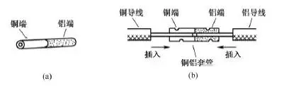 一種方法是采用銅鋁連接套管。銅鋁連接套管的一端是銅質(zhì),另一端是鋁質(zhì),如圖15(a)所示。使用時將銅導(dǎo)線的芯線插入套管的銅端,將鋁導(dǎo)線的芯線插入套管的鋁端,然后壓緊套管即可,如圖15(b)所示。