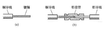 另一種方法是將銅導(dǎo)線鍍錫后采用鋁套管連接。由于錫與鋁的標準電極電位相差較小,在銅與鋁之間夾墊一層錫也可以防止電化腐蝕。具體做法是先在銅導(dǎo)線的芯線上鍍上一層錫,再將鍍錫銅芯線插入鋁套管的一端,鋁導(dǎo)線的芯線插入該套管的另一端,最后壓緊套管即可,如圖16所示。
